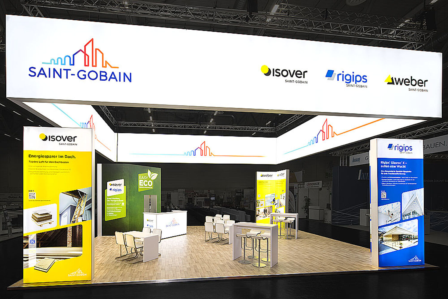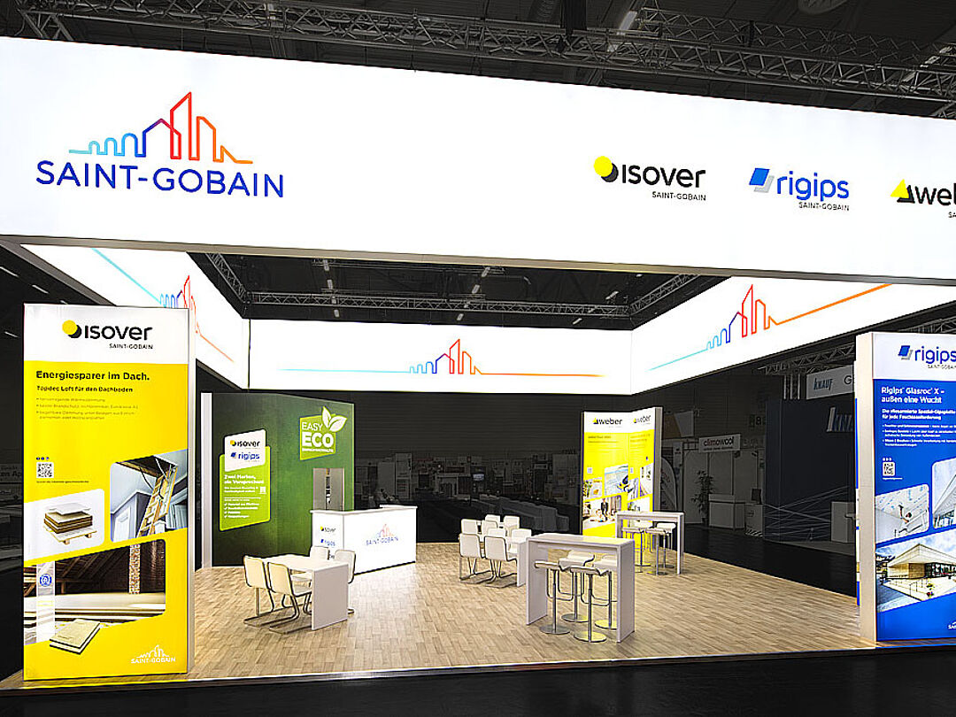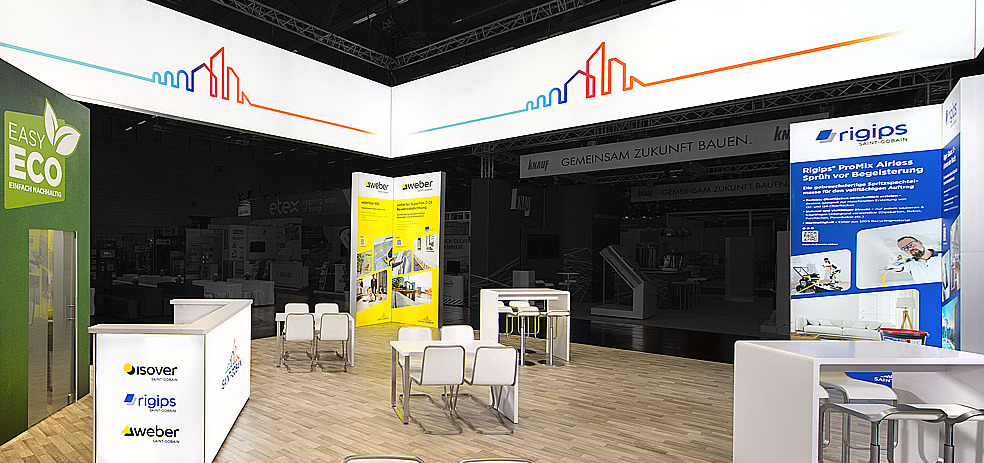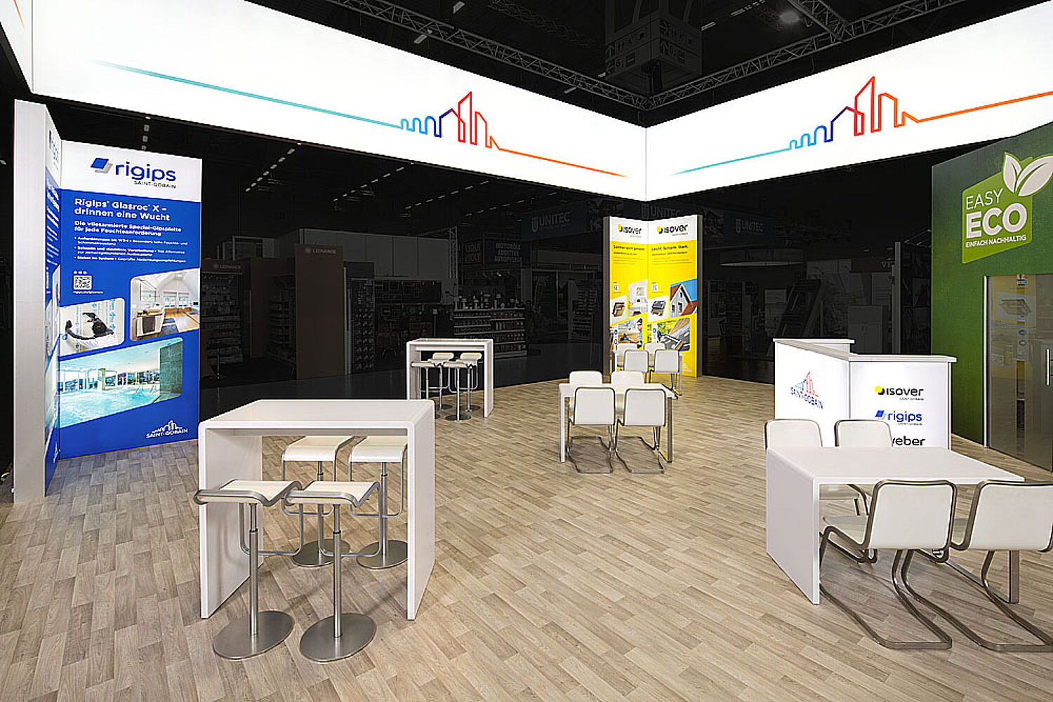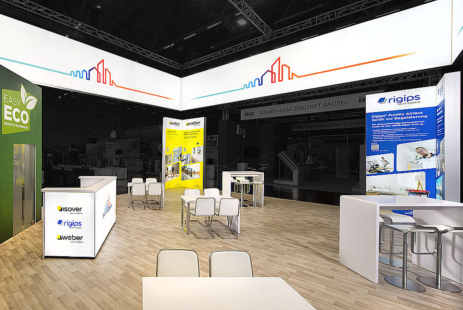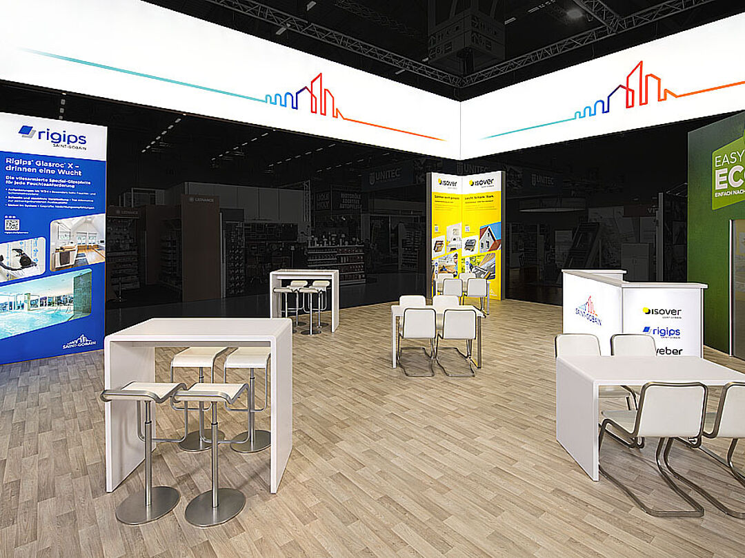 Eines der ältesten Unternehmen der Welt, gegründet 1665 in Frankreich, ist heute europäischer Marktführer für innovative Bauprodukte. Auf der Eurobaustoff-Forum präsentiert sich das Unternehmen mit drei Fachbereichen offen und einladend. Im Vordergrund stehen die Gespräche mit Fachbesuchern, die Produktpräsentation ist auf die grafische Darstellung fokussiert. Dadurch konnten die Anwendungsmöglichkeiten emotional zur Wirkung gebracht werden. Durch den großen Deckenkranz war der Stand aus jeder Hallenecke von weitem sichtbar und sorgte für einen die Standfläche vergrößernden Eindruck. Alle eingesetzten Materialien können wiederholt eingesetzt werden.