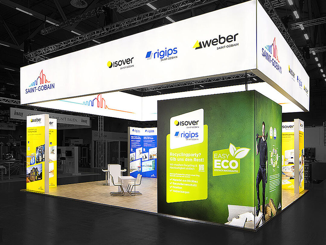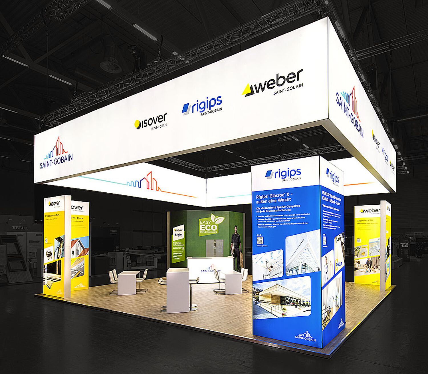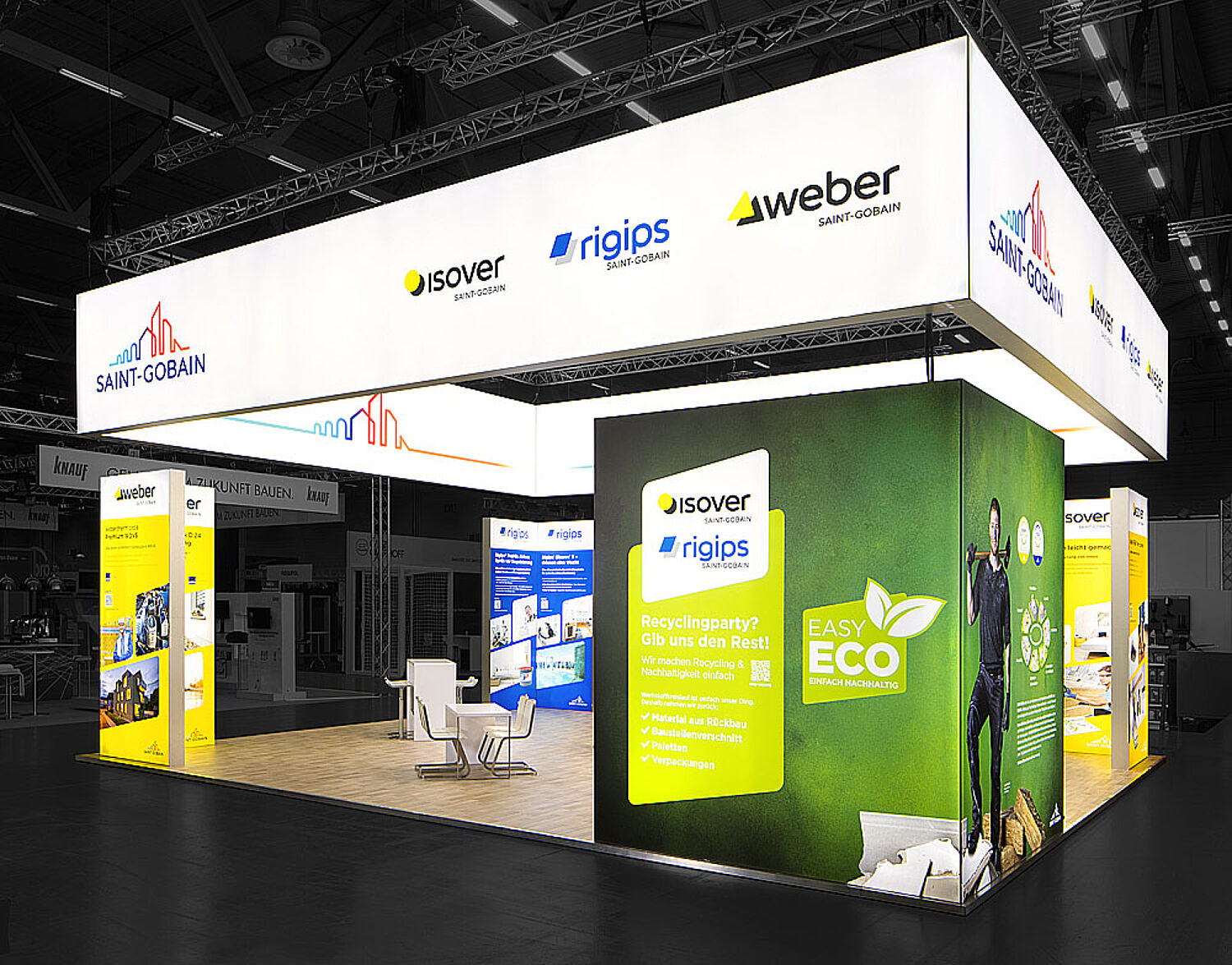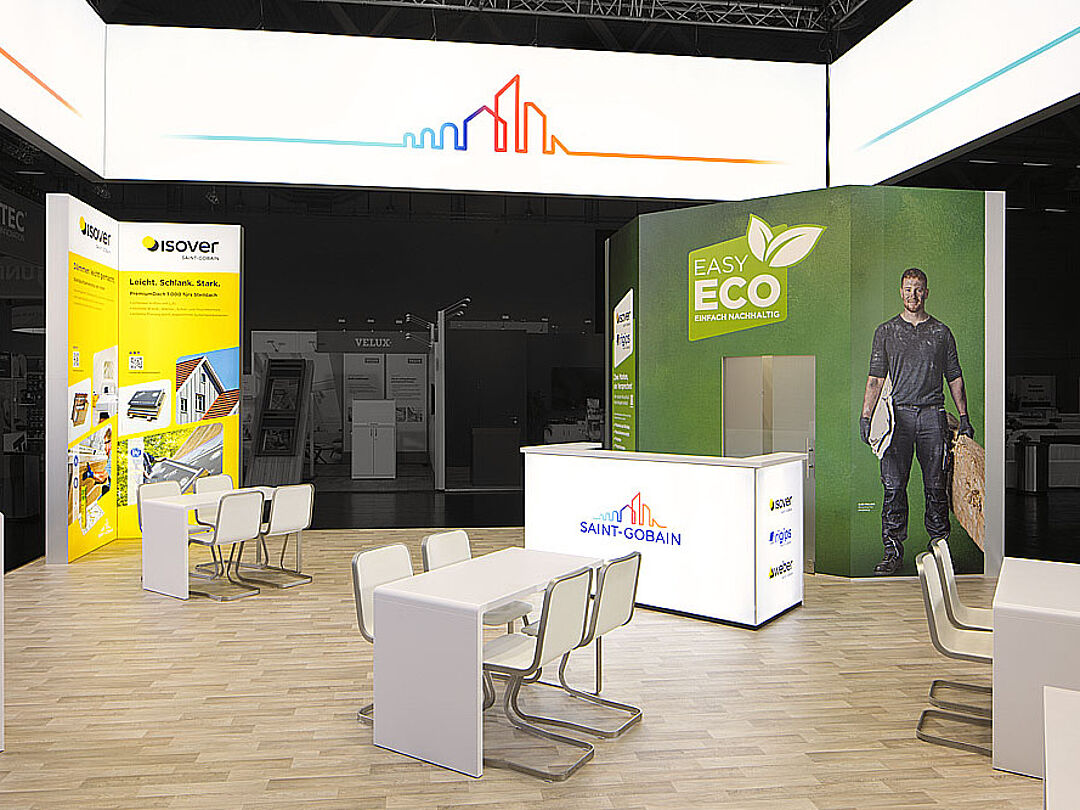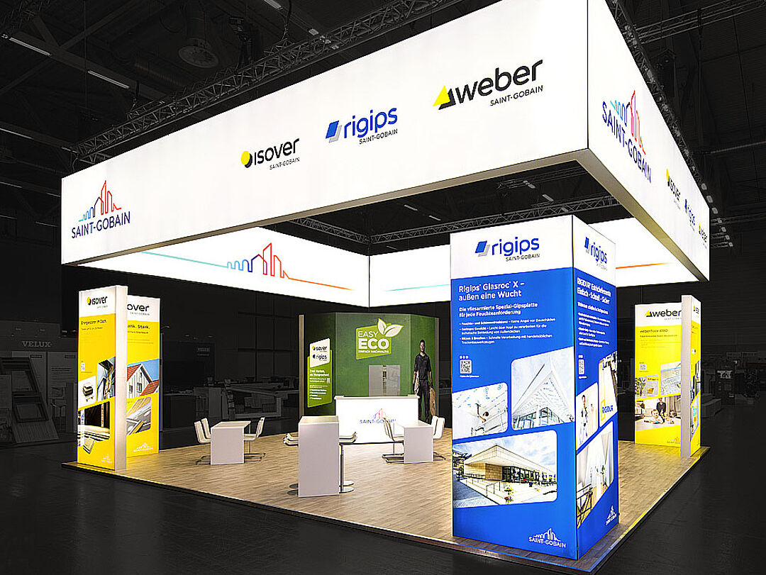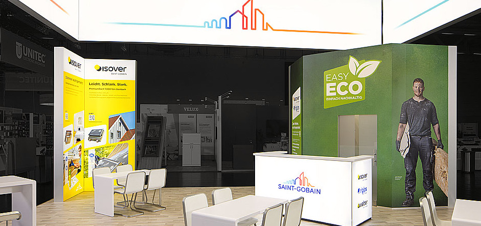 Eines der ältesten Unternehmen der Welt, gegründet 1665 in Frankreich, ist heute europäischer Marktführer für innovative Bauprodukte. Auf der Eurobaustoff-Forum präsentiert sich das Unternehmen mit drei Fachbereichen offen und einladend. Im Vordergrund stehen die Gespräche mit Fachbesuchern, die Produktpräsentation ist auf die grafische Darstellung fokussiert. Dadurch konnten die Anwendungsmöglichkeiten emotional zur Wirkung gebracht werden. Durch den großen Deckenkranz war der Stand aus jeder Hallenecke von weitem sichtbar und sorgte für einen die Standfläche vergrößernden Eindruck. Alle eingesetzten Materialien können wiederholt eingesetzt werden.