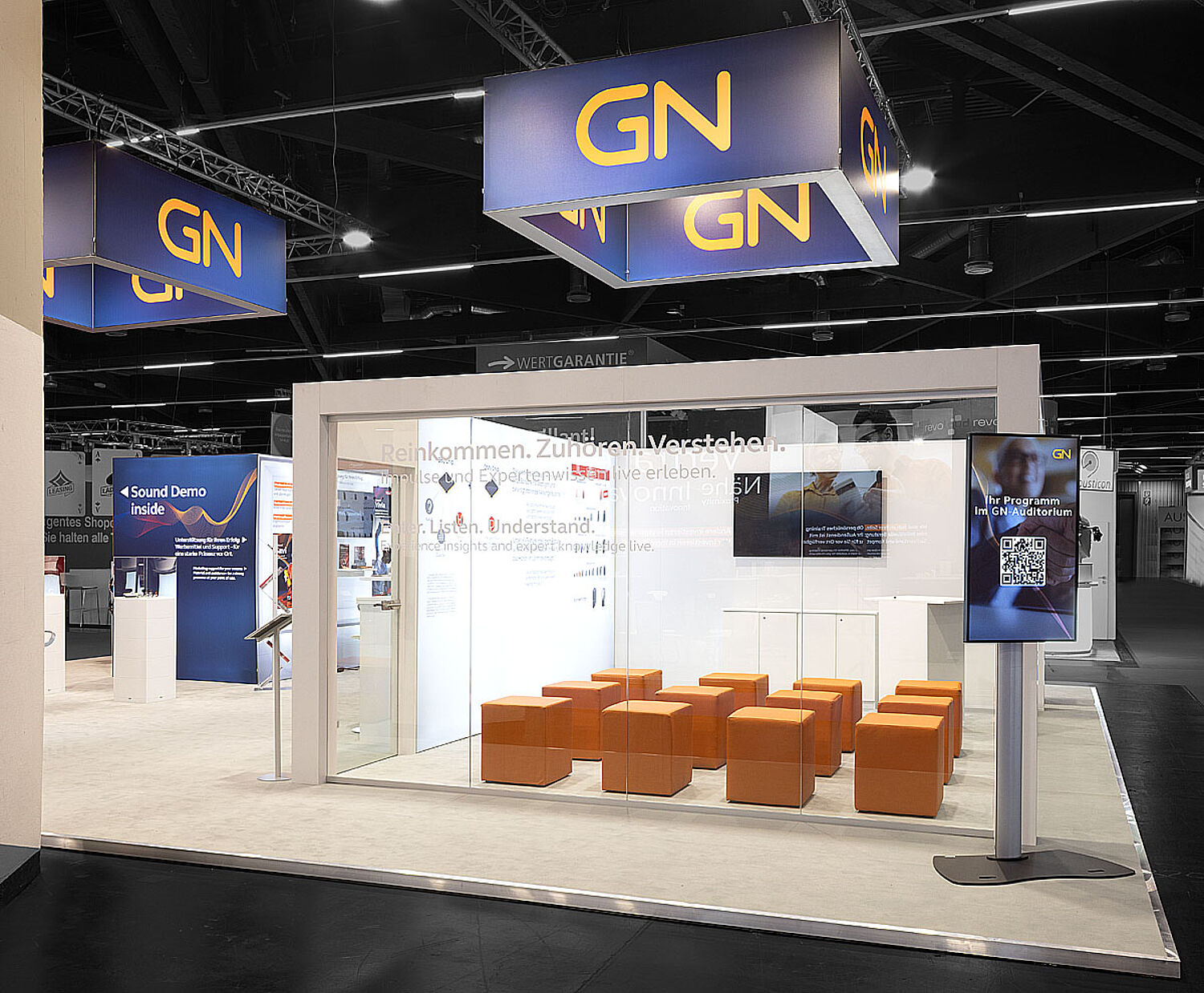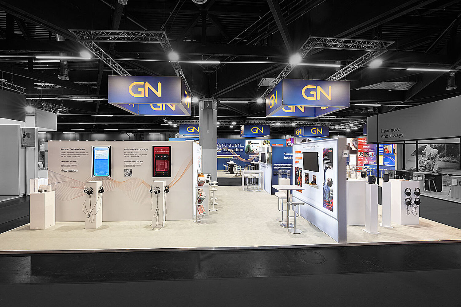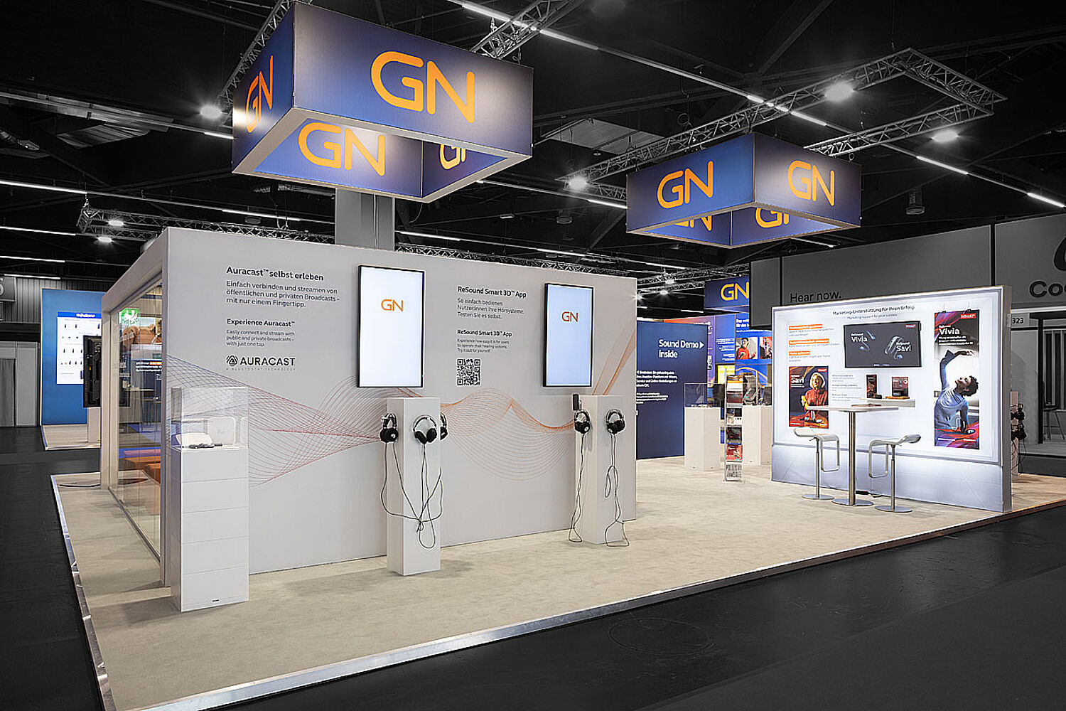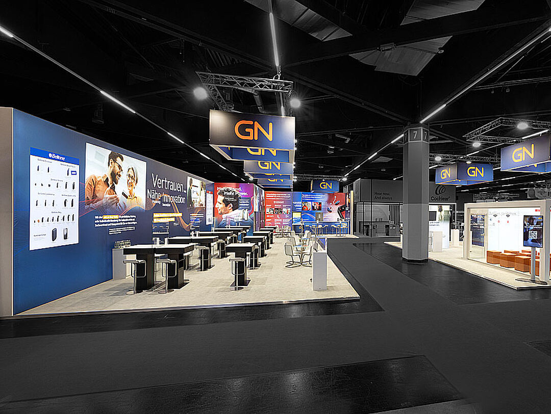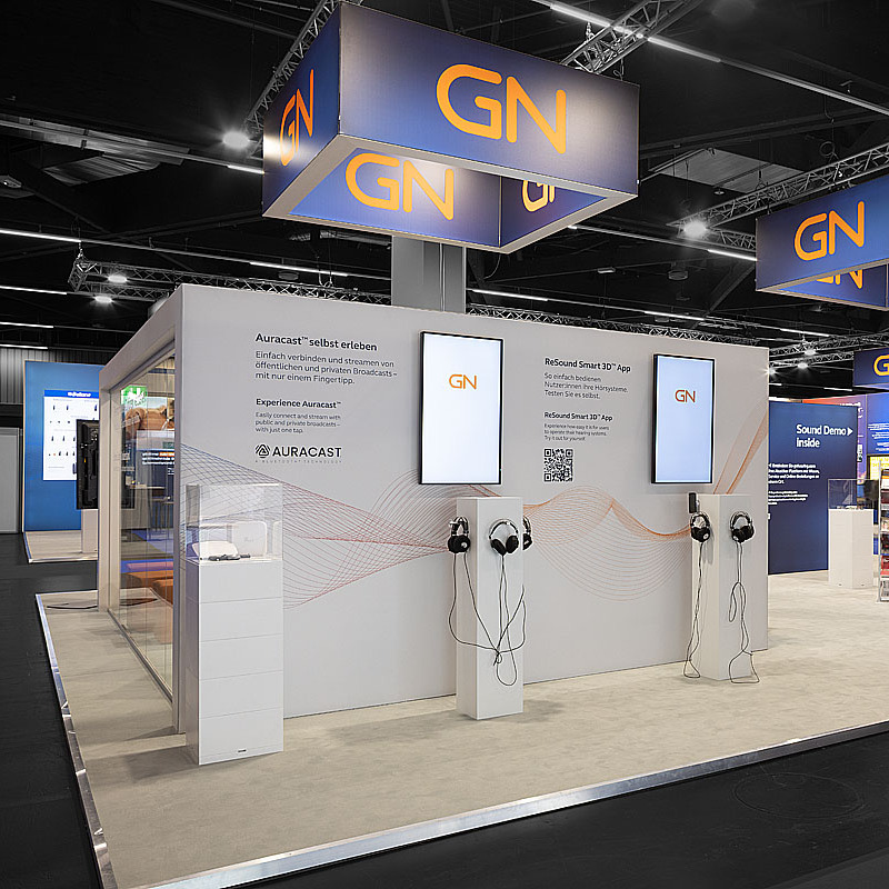 GN Hearing, einer der führenden Hersteller von Hörgeräten aus Dänemark, präsentierte sich auf der kongressbegleitenden Messe in Hannover und Nürnberg mit seinen Marken Resound, Beltone und Interton. Glet.bewegt entwickelte ein offenes Standkonzept komplett aus LED-Leuchtwänden mit vollflächigen Textildrucken – die längste Wand mit 20 Metern Länge und einer Höhe von 4 Metern kommt ohne Systemteilungen aus. Der Messeauftritt entwickelte sich zum Besuchermagneten, wobei die großflächige Grafik alle Blicke anzog und jedem Besucher die Möglichkeit gab auf Entdeckungsreise zu gehen.