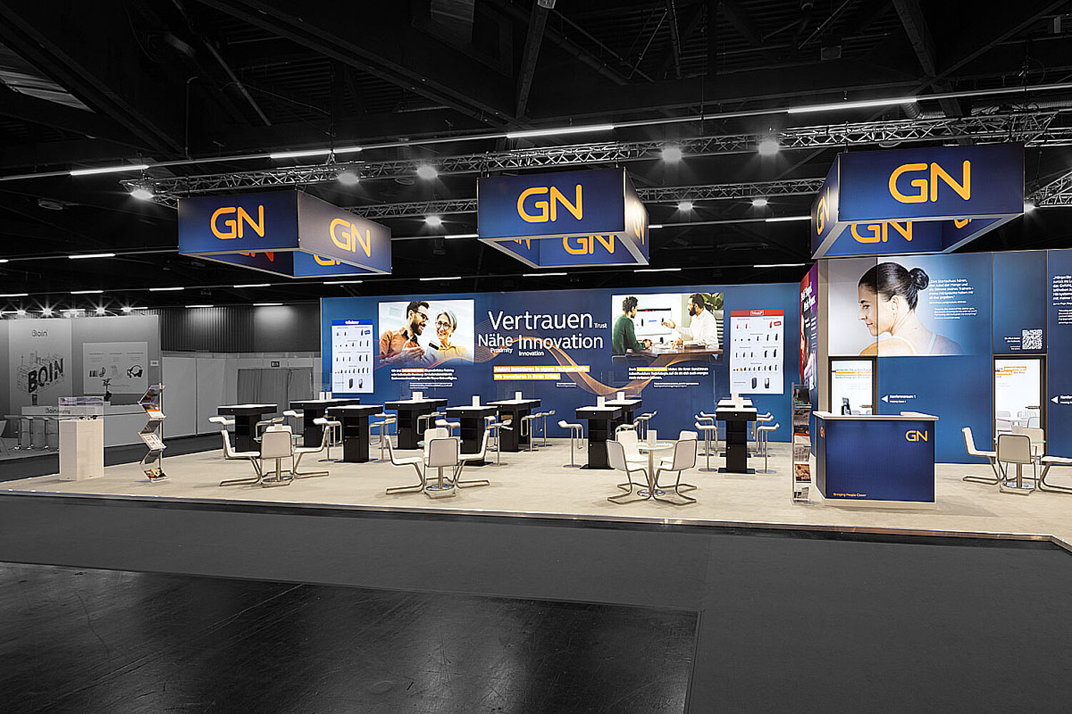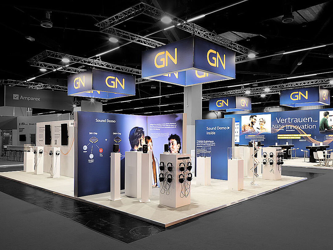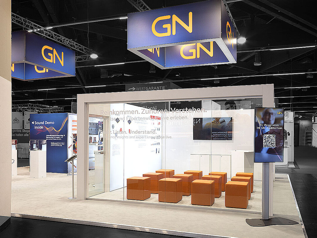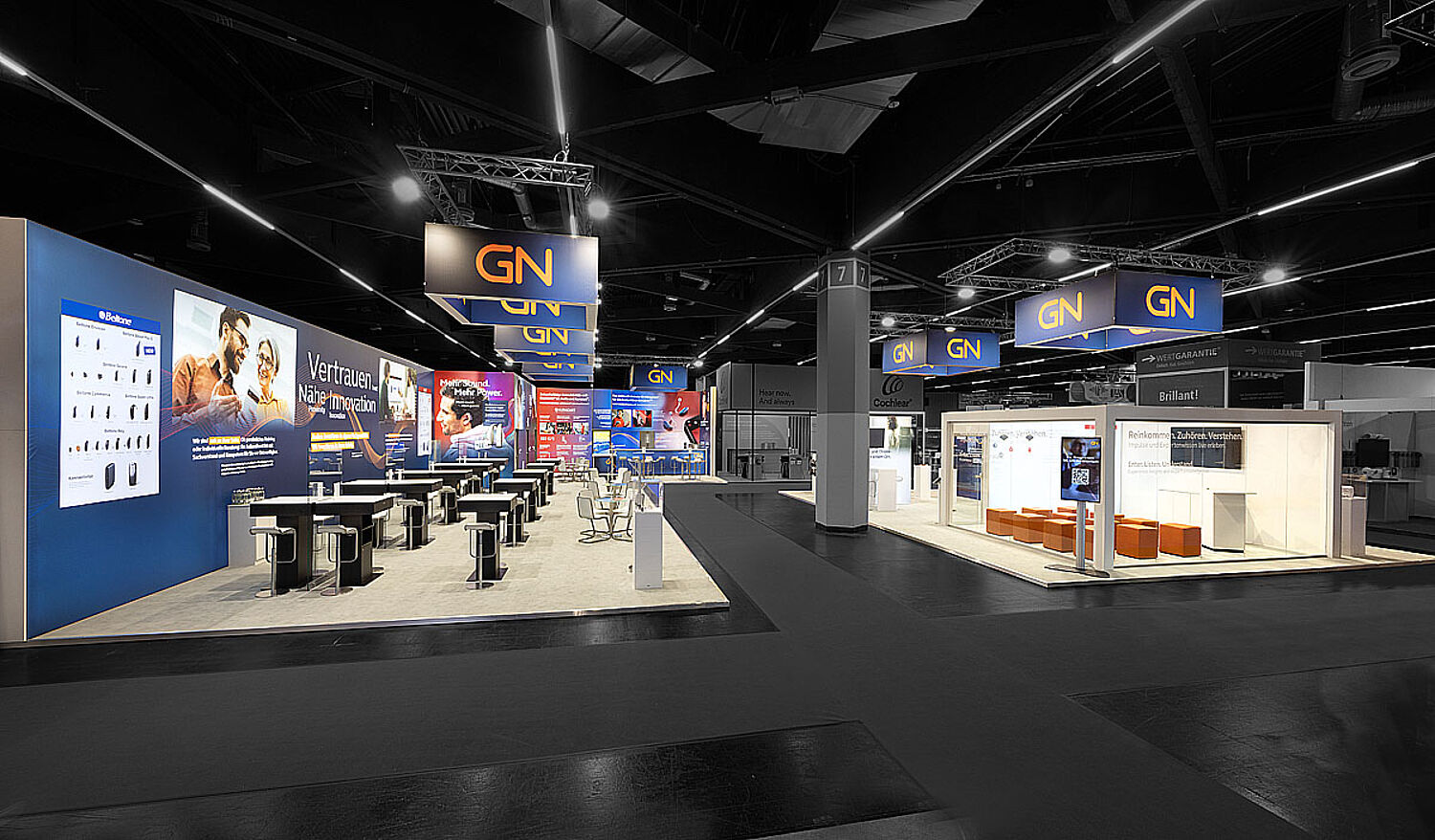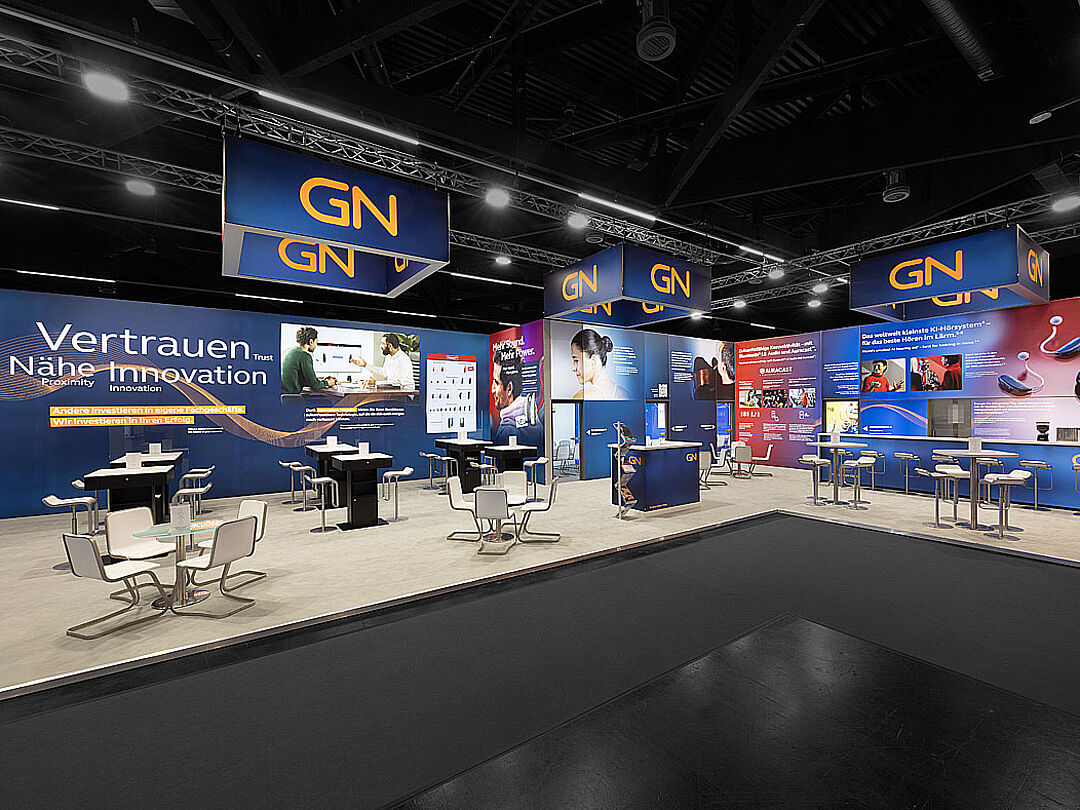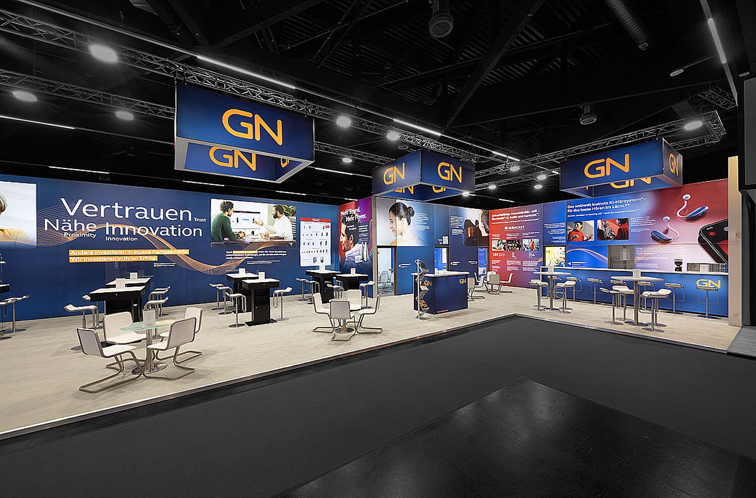 GN Hearing, einer der führenden Hersteller von Hörgeräten aus Dänemark, präsentierte sich auf der kongressbegleitenden Messe in Hannover und Nürnberg mit seinen Marken Resound, Beltone und Interton. Glet.bewegt entwickelte ein offenes Standkonzept komplett aus LED-Leuchtwänden mit vollflächigen Textildrucken – die längste Wand mit 20 Metern Länge und einer Höhe von 4 Metern kommt ohne Systemteilungen aus. Der Messeauftritt entwickelte sich zum Besuchermagneten, wobei die großflächige Grafik alle Blicke anzog und jedem Besucher die Möglichkeit gab auf Entdeckungsreise zu gehen.