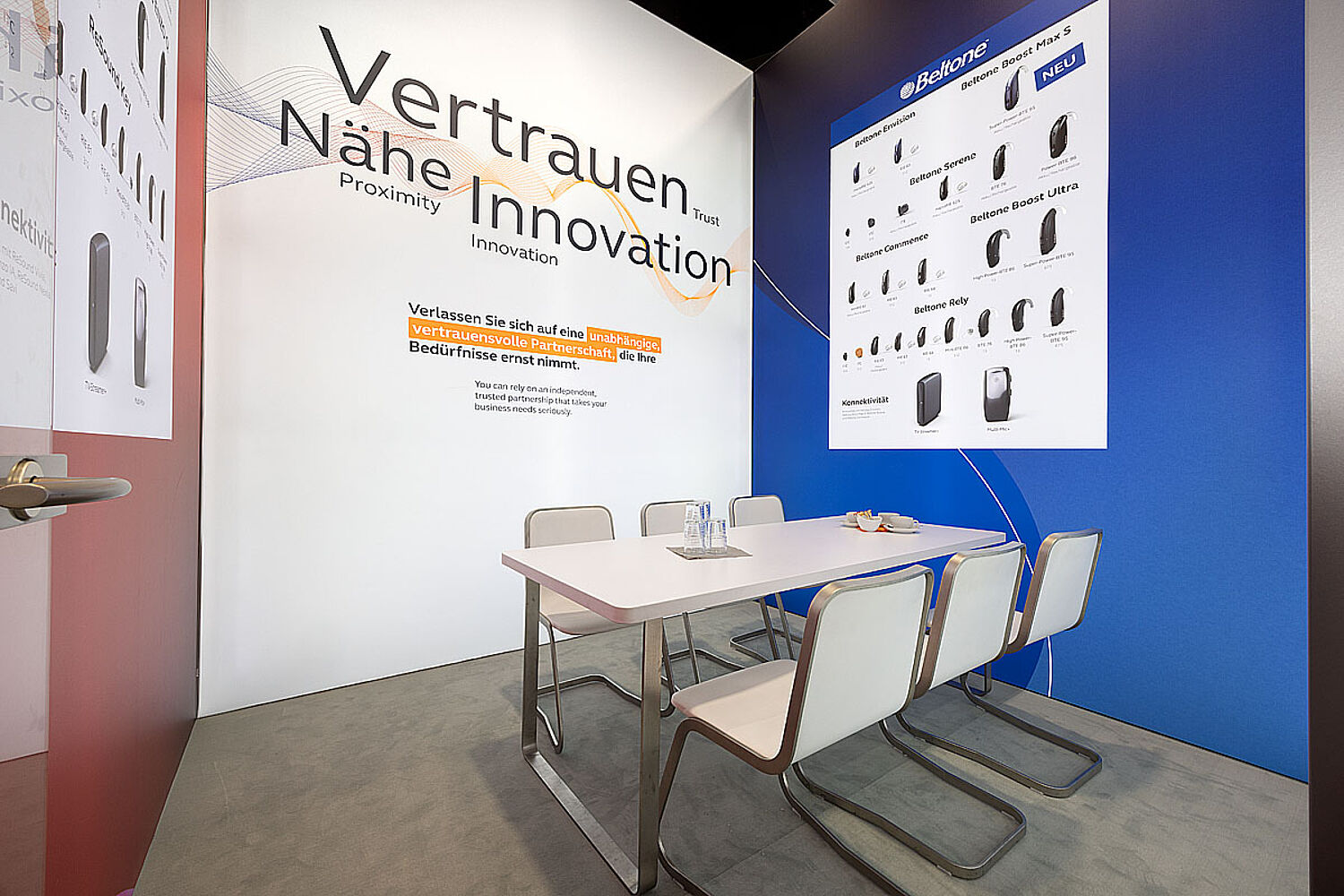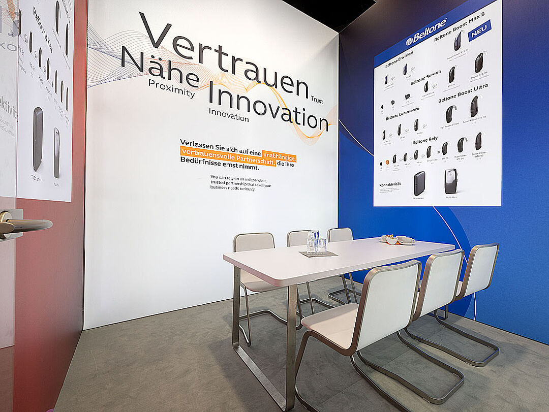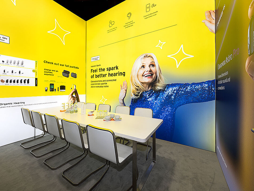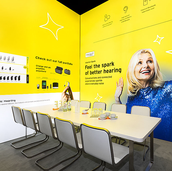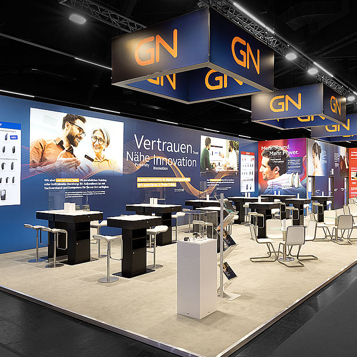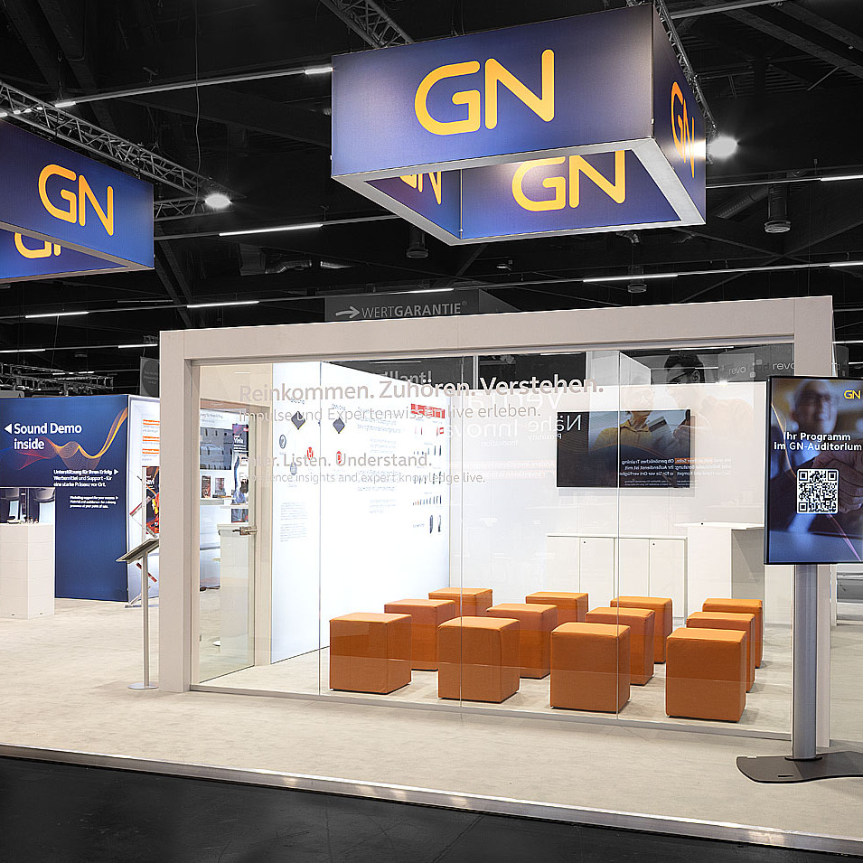 GN Hearing, einer der führenden Hersteller von Hörgeräten aus Dänemark, präsentierte sich auf der kongressbegleitenden Messe in Hannover und Nürnberg mit seinen Marken Resound, Beltone und Interton. Glet.bewegt entwickelte ein offenes Standkonzept komplett aus LED-Leuchtwänden mit vollflächigen Textildrucken – die längste Wand mit 20 Metern Länge und einer Höhe von 4 Metern kommt ohne Systemteilungen aus. Der Messeauftritt entwickelte sich zum Besuchermagneten, wobei die großflächige Grafik alle Blicke anzog und jedem Besucher die Möglichkeit gab auf Entdeckungsreise zu gehen.